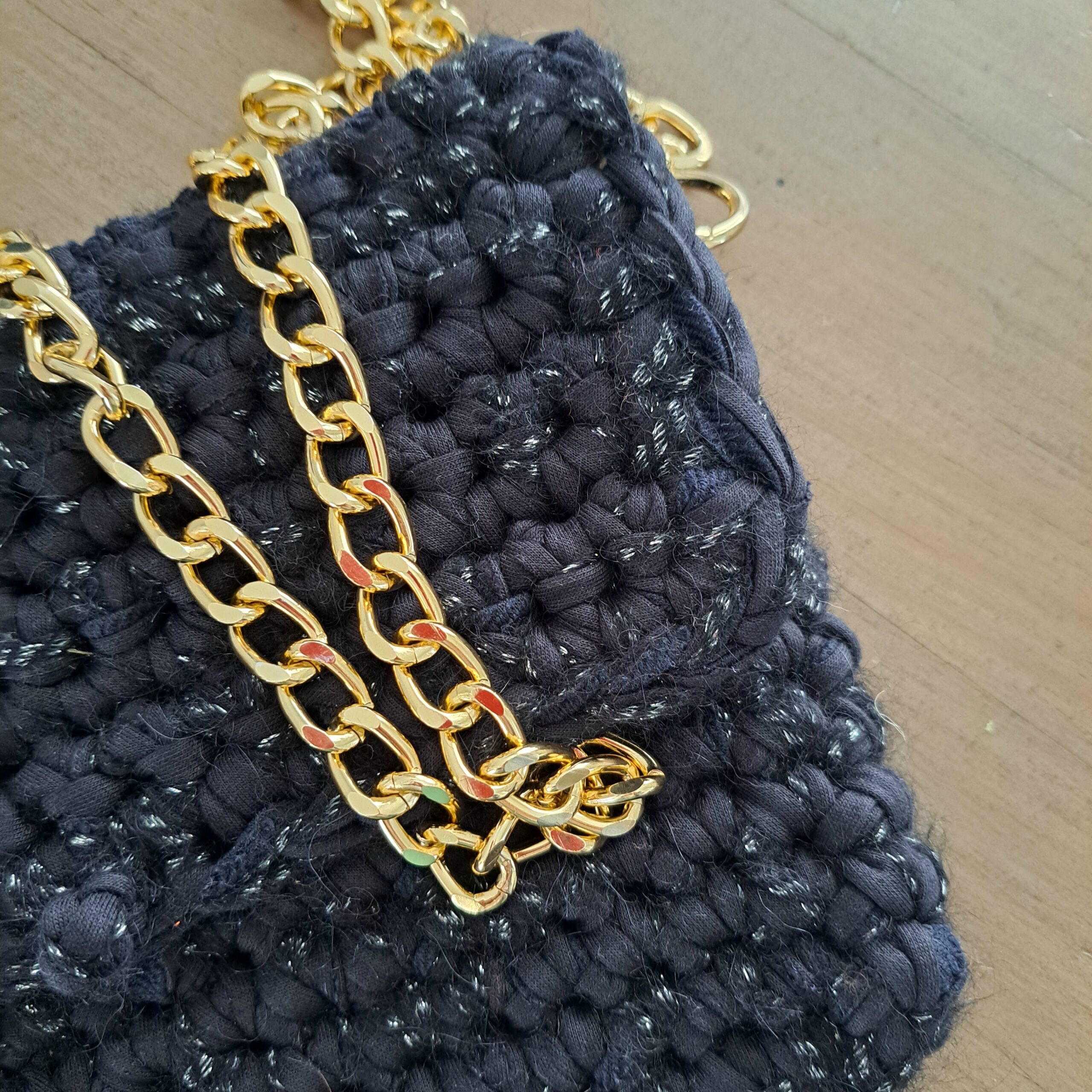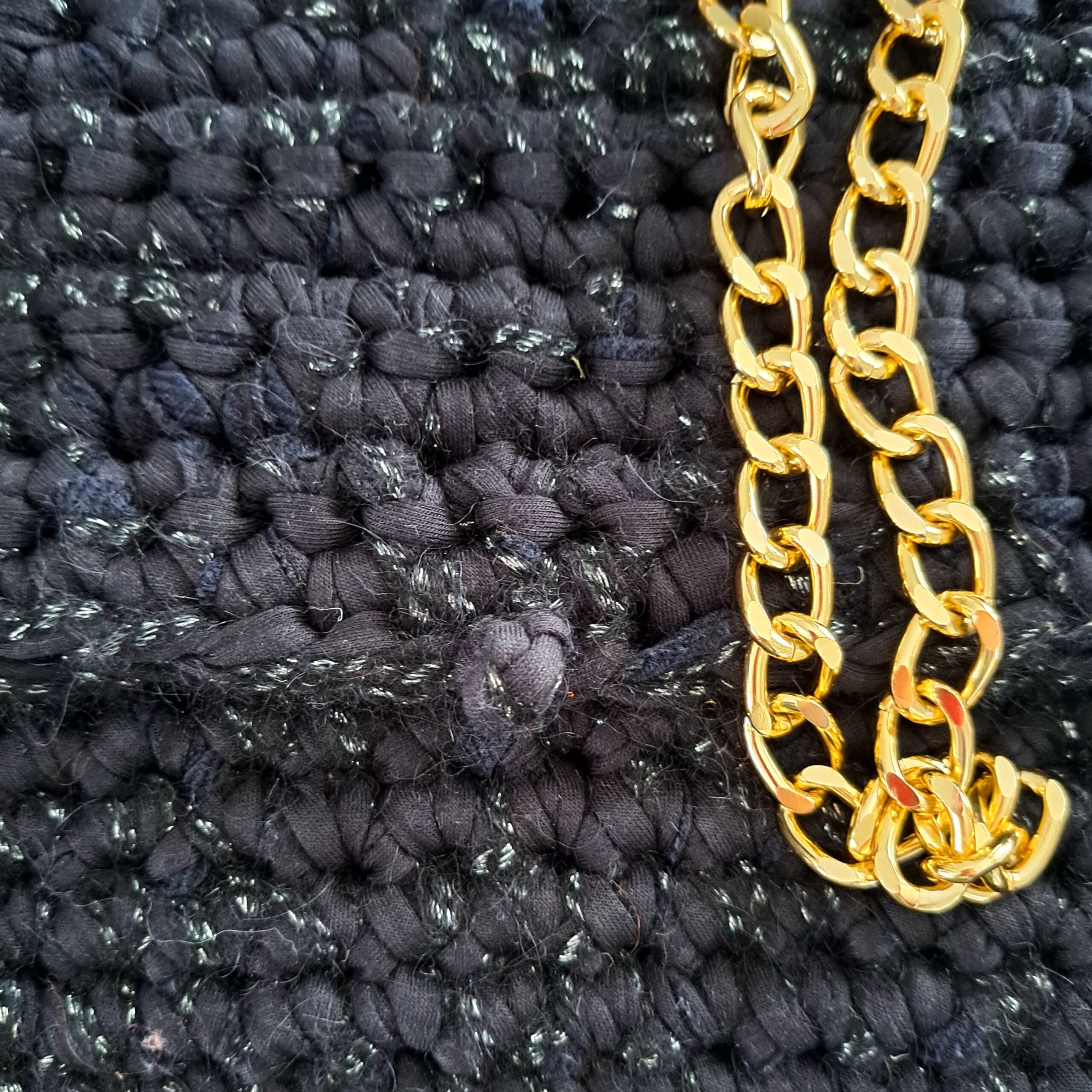 Crocheté avec du trapilho (fil recyclé issu des chutes de la confection) et un fil velours (100% acrylique)